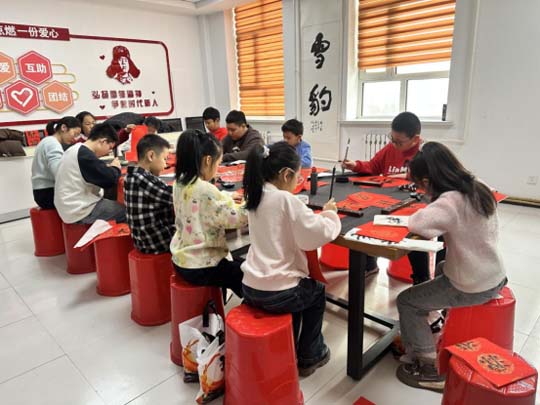 活动现场,大红春联纸整齐铺展,笔墨香萦绕其间,孩子们个个精神饱满、兴致高昂,有的凝神静气,一笔一画临摹经典春联;有的自信挥洒,将对新春的期盼、对生活的美好祝愿融入笔墨之中。“和顺一门有百福,平安二字值千金”“文明社区春风暖,友爱邻里福气多”等寓意吉祥的语句跃然纸上,既饱含传统韵味,又彰显文明新风,每一幅作品都充满童真与暖意。