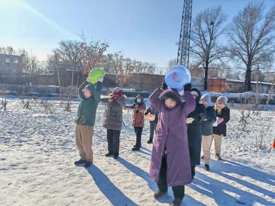 活动现场,广场上热闹非凡。运动会设置了“雪地精准传”“背靠背夹气球”“雪地接力赛”等多个冰雪项目,兼具趣味性与协作性,让参与者在冰天雪地中尽享运动乐趣。在“雪地精准传”环节,选手们排成一列纵队,手持运雪工具依次接力。前方选手全程不得回头,需小心翼翼地将容器中的雪精准倒入后方队友的器具内。整个过程不仅考验着团队成员间的配合默契与身体平衡能力,更要求整支队伍在稳步前行中尽可能减少雪的洒落。“背靠背夹气球”项目中,两人一组并肩而立,在雪地中小心翼翼侧身前行。行进途中,气球不时滑脱落地,引得场边围观群众阵阵欢呼与大笑。最令人热血沸腾的当属“雪地接力赛”,队员们深一脚浅一脚地在雪地中全力冲刺,激烈的比拼将现场气氛推向顶点。赛场外,未参赛的居民们自发组成啦啦队,为选手们加油助威,广场上处处洋溢着欢乐、和谐的氛围。