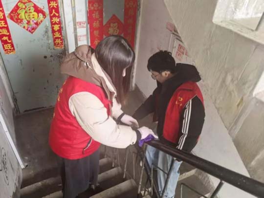 活动当天,志愿者们身着统一志愿服装,化身“环境美容师”,分成多个小组,有条不紊地开展环境整治工作。大家分工协作、默契配合,重点对辖区新光明小区4号楼、国税楼、供应处3号楼周边区域,以及楼道角落、单元内扶手进行全面清理,仔细捡拾白色垃圾、认真擦拭单元扶手,不放过一处卫生死角。活动中,志愿者们还向过往居民发放文明创建宣传手册,倡导大家养成垃圾分类、爱护环境的良好习惯,鼓励更多居民主动参与到社区环境治理中来,着力营造“人人参与、共建共享”的良好氛围。